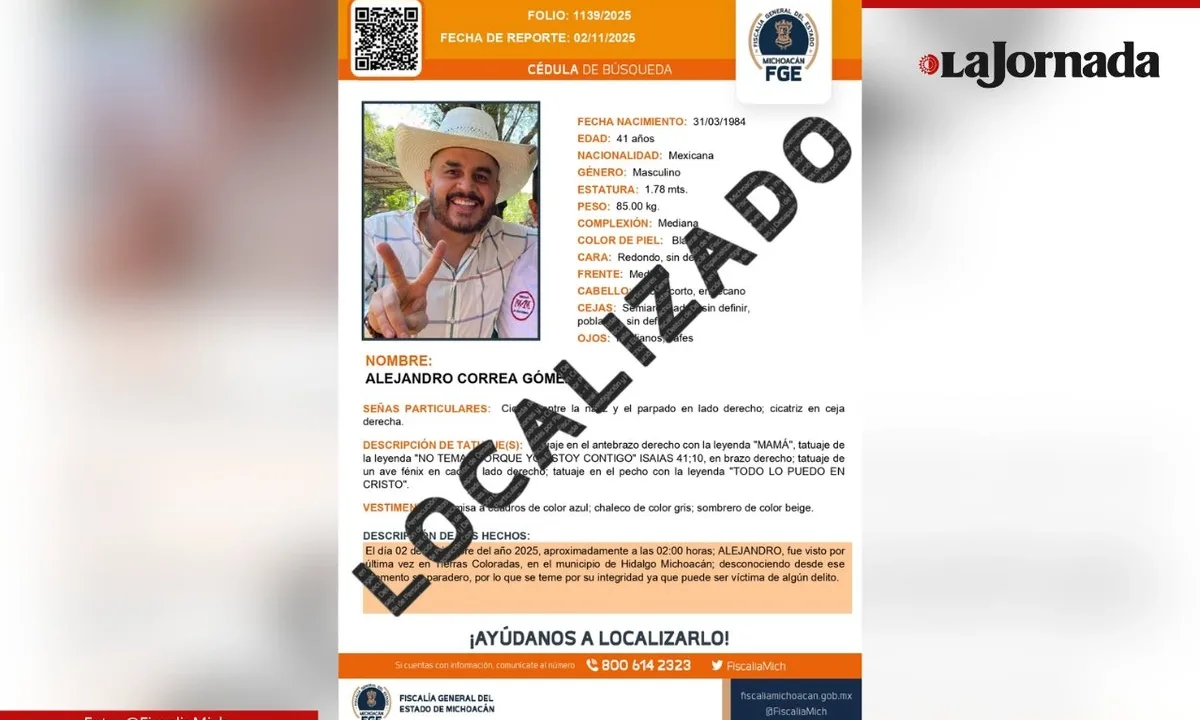 Michoacán. La Fiscalía General del Estado (FGE) de Michoacán informó que se localizó con vida al ex presidente municipal morenista de Zinapécuaro, Alejandro Correa Gómez, quien fue reportado como desaparecido el pasado 2 de noviembre.
