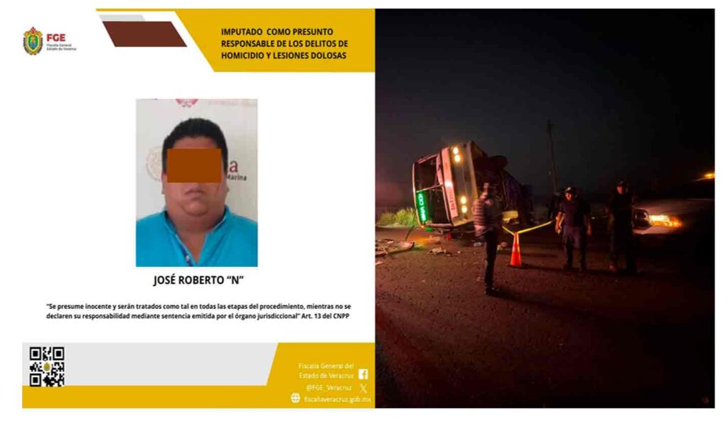 La Fiscalía General del Estado de Veracruz informó que José Roberto «N» fue presentado ante el órgano jurisdiccional por la Fiscalía Regional Veracruz, donde se expusieron los datos de prueba relacionados con el accidente ocurrido en el municipio de Alvarado.